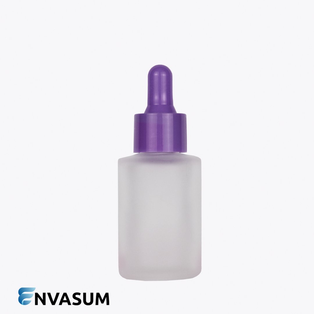 El frasco de vidrio mate (frost) de 30 ml con gotero morado fusiona elegancia, innovación y personalidad.