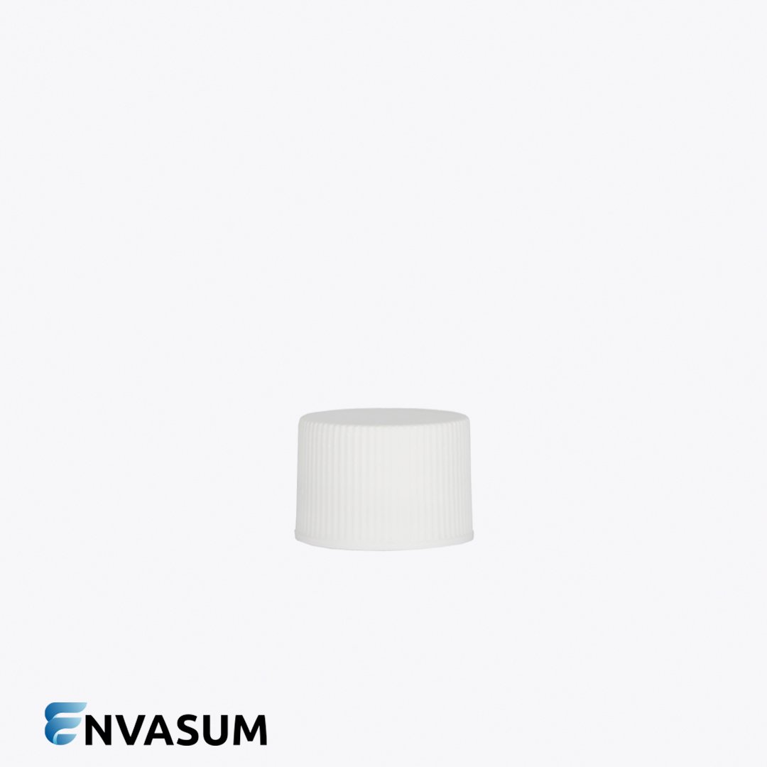 Tapa plana R24/410 estriada en blanco, fabricada en PP  con liner espumado (Polyfoam) para un sellado óptimo. El acabado estriado facilita el manejo mientras que su perfil ciego ofrece sofisticación. Ideal para aplicaciones cosméticas, farmacéuticas y alimenticias, brinda una solución de tapado segura, estética y personalizable de alta calidad.